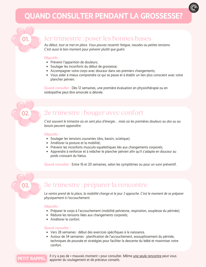 Chaque trimestre de grossesse apporte son lot de changements et de nouvelles raisons de consulter en physiothérapie périnéale ou en ostéopathie. Voici un guide pour savoir à quel moment une consultation peut être bénéfique.