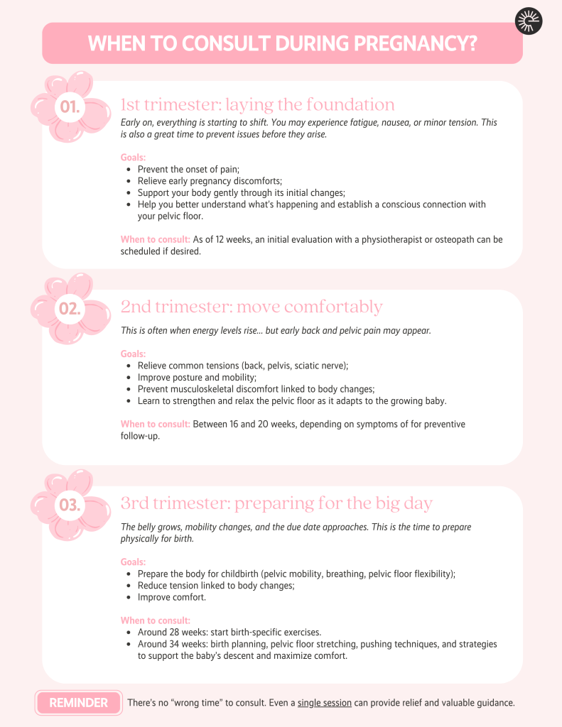 Each trimester brings changes and new reasons to consult a pelvic floor physiotherapist or osteopath. Here’s a guide to know when a consultation can be beneficial.